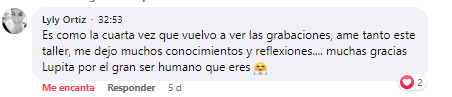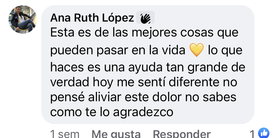 “Me cayeron tantos veintes y ‘aha moments’... ahora entiendo por qué me siento como me siento. Tengo mayor claridad de mi principal herida y la importancia de bajar del pensamiento al sentir. Ahora estoy conectada con mi energía femenina y puedo tomar mejores decisiones. ¡Qué gran aprendizaje!”